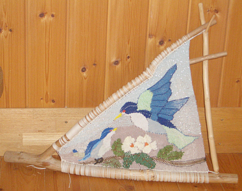 大型の機織り機(縦機)は幅の広い風景などの絵織り、4枚そうこうの機織り機(横機・高機)は模様織りや小さめのタペストリー、また、織り機なしで直接木の枝に経糸を張っても絵織りを楽しめ、むしろ自然な面白い物が出来上がります。