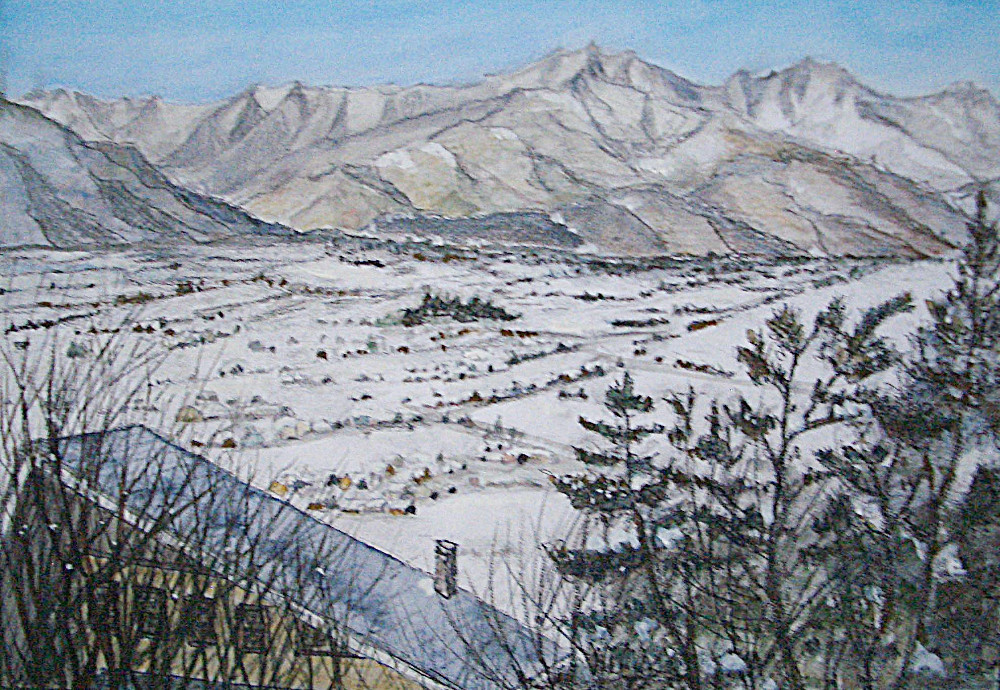 雪の積もった川と白馬の山々を橋の上で油性ペンを使って