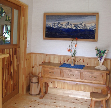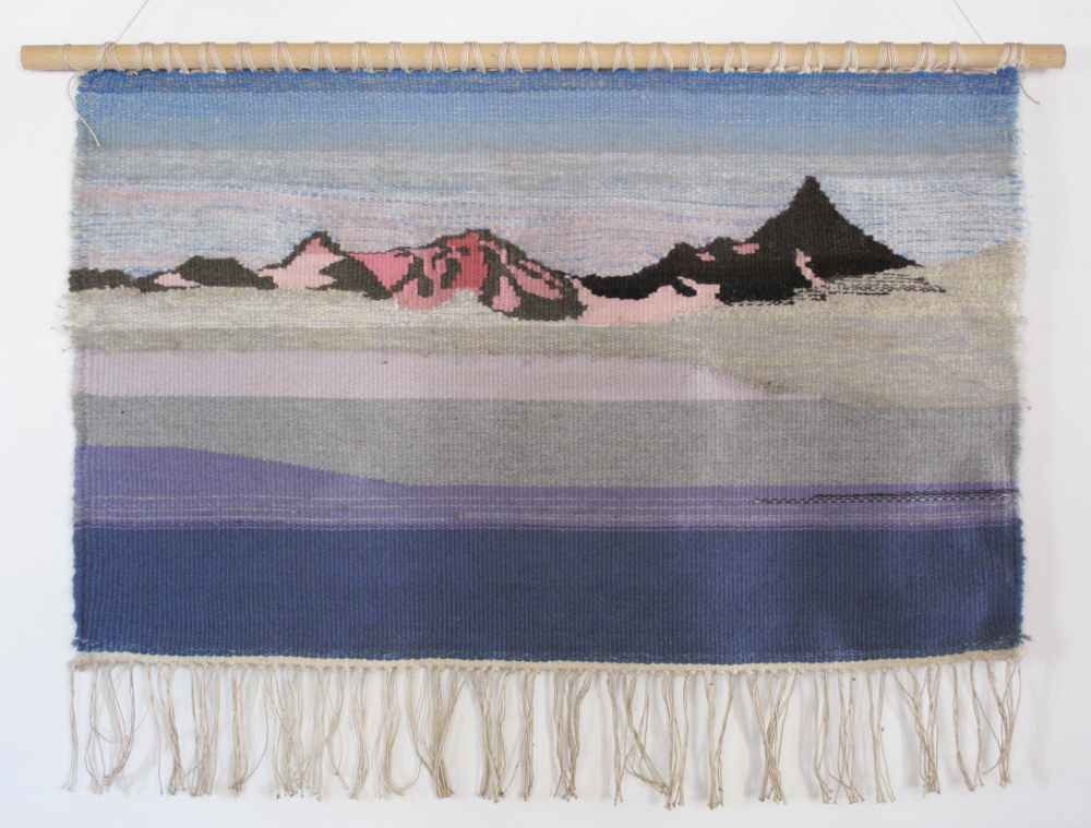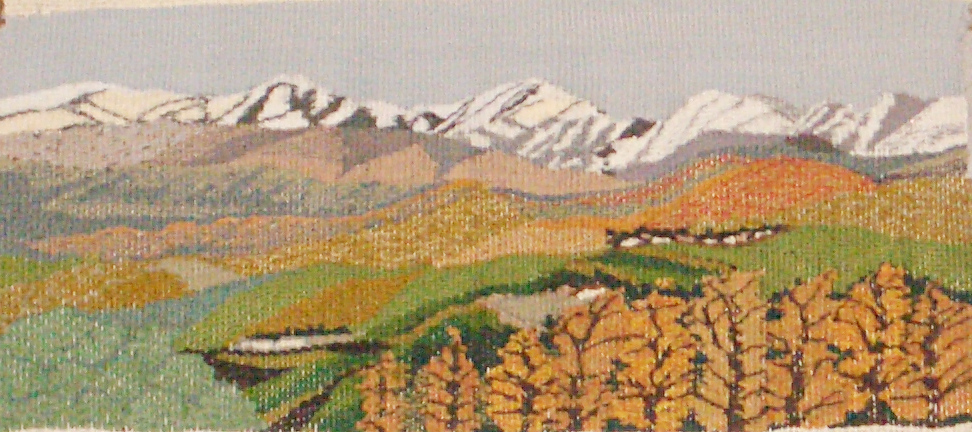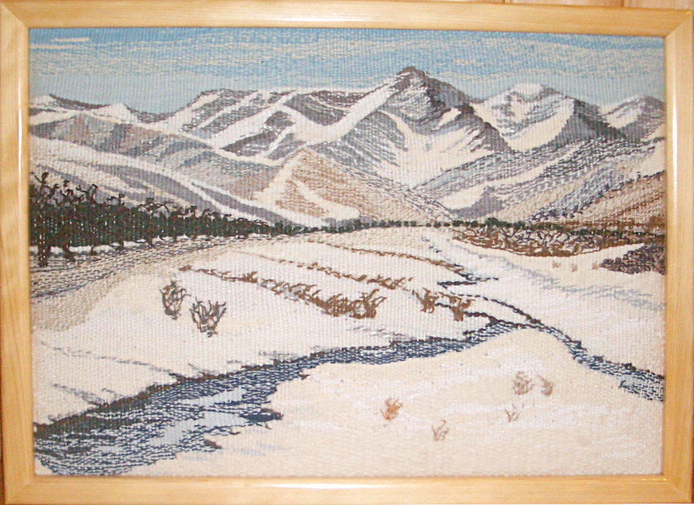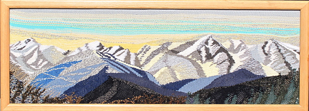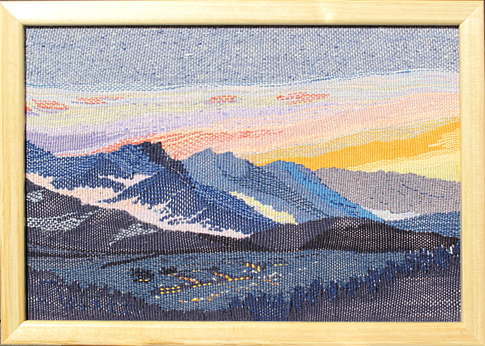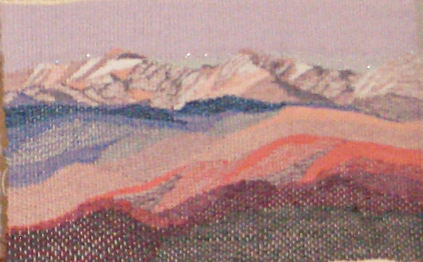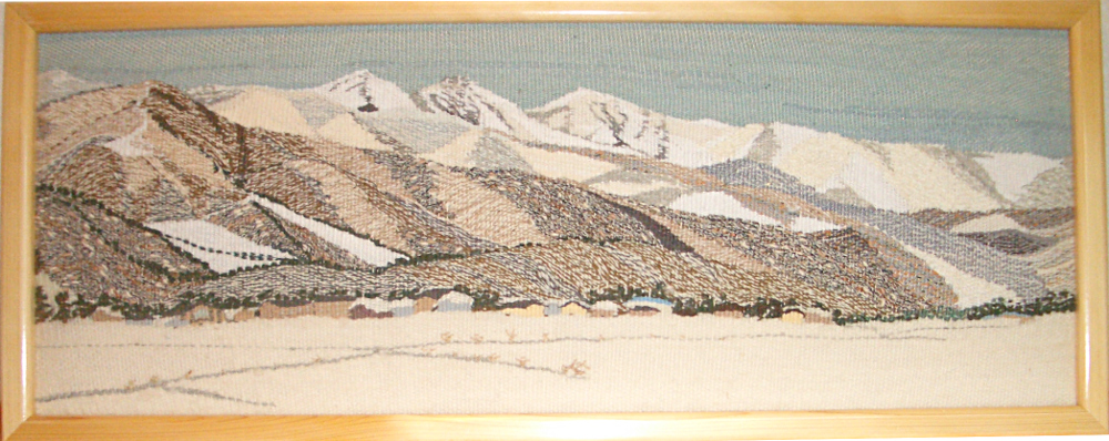 白馬岳から五竜岳が一望できる野平から見た景色、40年位前登山した時を思い出しながら絵織物にしました。