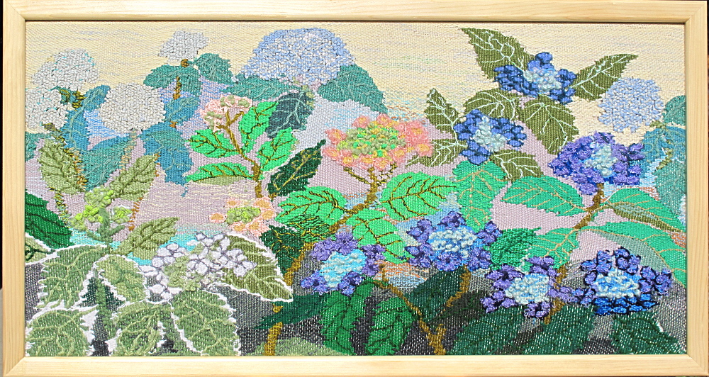 作品の額はすべて夫が作った物です。私の絵織物が気ままなサイズなのでその都度、絵にあった額を作ってもらっています。私の作品が生きてくるのも額(夫)のおかげだと思っています。