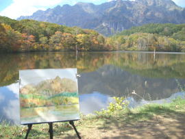 10月上旬の紅葉の頃です。水面には戸隠の山が美しく映っていました。